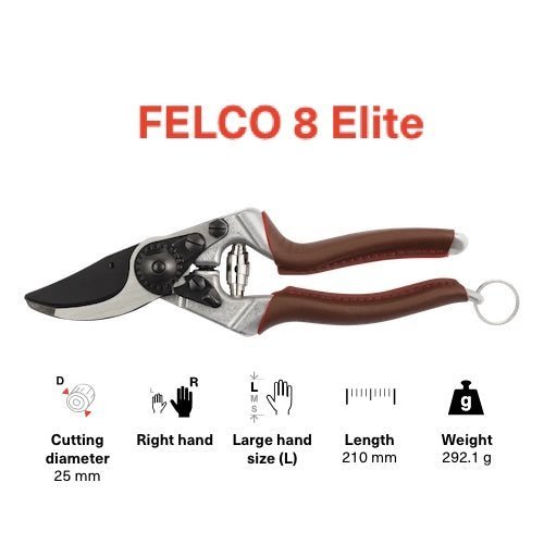 Felco 8 Elite – rekomenduojamas tiems, kurie jau turi didesnes rankas arba nori atsparumo, patvarumo ir profesionalaus lygio sekatorių. Puikus pasirinkimas arboristams, sodininkams, rožininkams, dirbantiems su vaismedžiais ar krūmais, kai reikia pjauti storas, kietas šakas iki 25 mm, ir turėti papildomą funkcionalumą, pvz., vielos kirpimą.