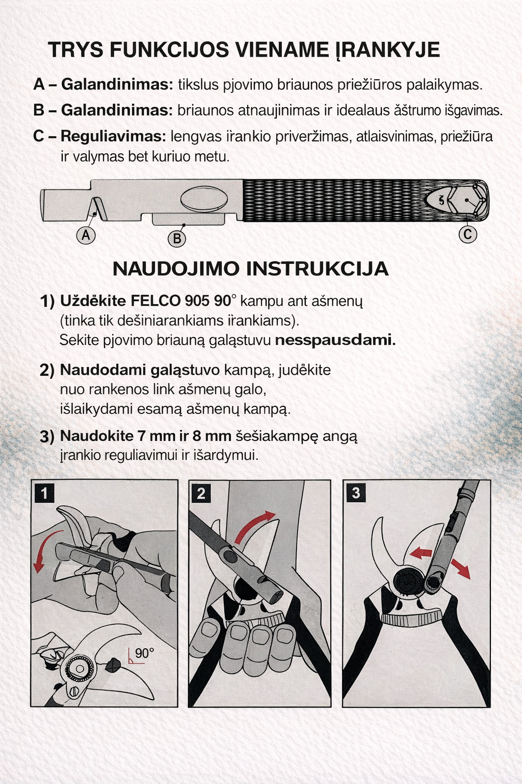Felco 905 daugiafunkcinis galandimo reguliavimo įrankis, skirtas greitai ir efektyviai dešiniarankių sekatorių bei „bypass“ tipo genėtuvų priežiūrai.