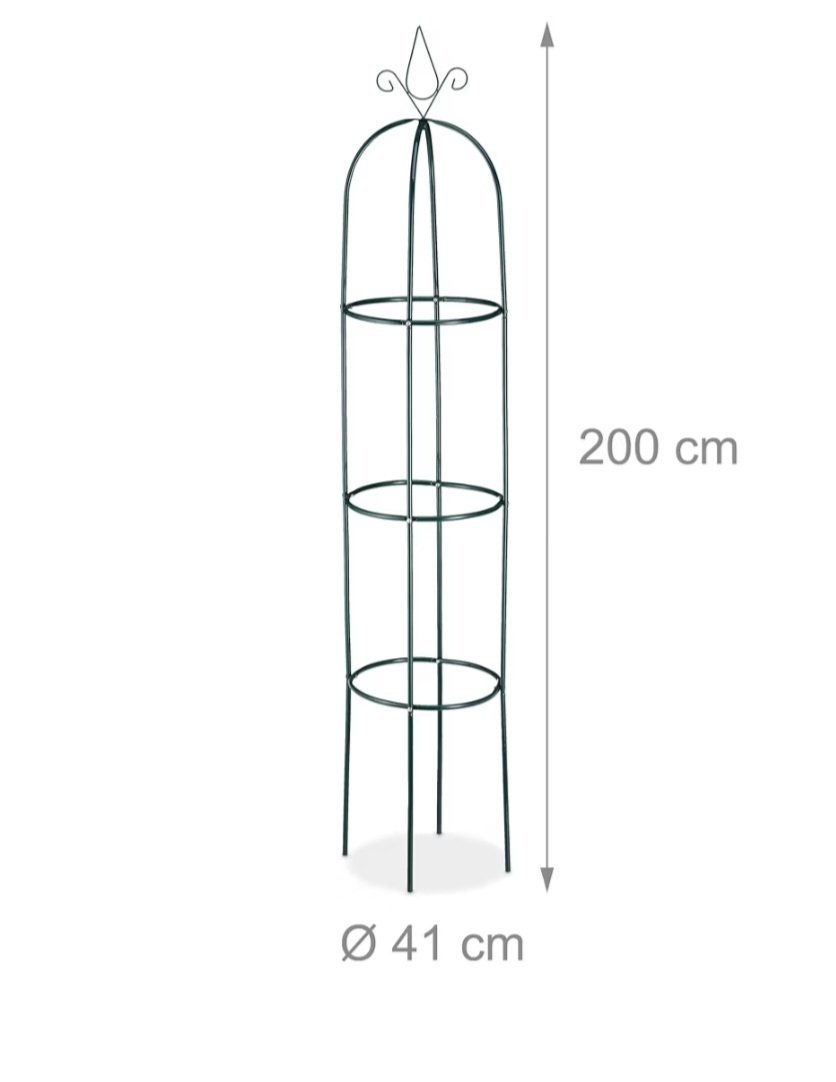 Tvirta metalinė konstrukcija užtikrina gerą stabilumą ir ilgaamžiškumą. Didelis 200 cm aukštis leidžia augalams augti vertikaliai ir formuoti vešlias kompozicijas. Atspari oro sąlygoms danga saugo nuo rūdžių. Tamsiai žalia spalva natūraliai įsilieja į sodo aplinką. Galima statyti tiek grunte, tiek vazone. Dekoratyvi viršutinė dalis suteikia estetinį vaizdą.