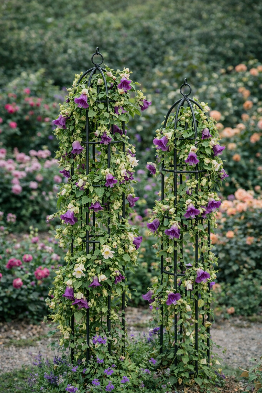 ⚠️ Netinka galingoms, sunkioms rožėms – obeliskai siauri ir lengvi, skirti lengvesniems augalams.